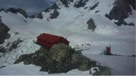 The following morning the group was helicoptered to Plateau Hut, high on a prominence above the confluence of three glaciers, well away from avalanche risk and close under Aoraki and several other peaks, a location called “The Grand Plateau”. This was to be the base for the course. The hut is new since 2005, the third in that location, large and Spartan but comfortable with solar powered lights and propane gas stoves and a very large refrigerator anywhere you would care to look outside.