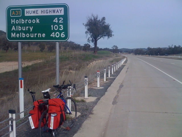 Time for my longest ride ever. At the beginning of my longest stretch of cycling ever. It still seems pretty silly, but getting Caddy to drive me to Yass to start the journey seems like a bit of a cop-out. 158km from Gungahlin to Gundagai. I dealt with it fairly capably, with a short break for real food (a sandwich) about 4 hours into the 6 hour ride. On arrival at Gundagai River Caravan Park I discovered that the clamps attaching my rack to the seat stay on my bike’s frame had slipped down the frame and were chipping away at the welds on the frame. After a short time panicking and considering calling Caddy for a rescue I confirmed that the weld was structurally sound, cut up a spare tube and wrapped the seat stay in rubber to protect it and prevent slippage. With repairs completed I showered (this was soon to become a highlight of my days), cleaned my tyres, stretched and ate a tremendous amount before wondering what I should do next. After spending a couple of hours reading H.P. Lovecraft’s ‘Call of Cthulu’ on my iPhone I walked into town to find more food. A cold night on an uncomfortable bed followed.
