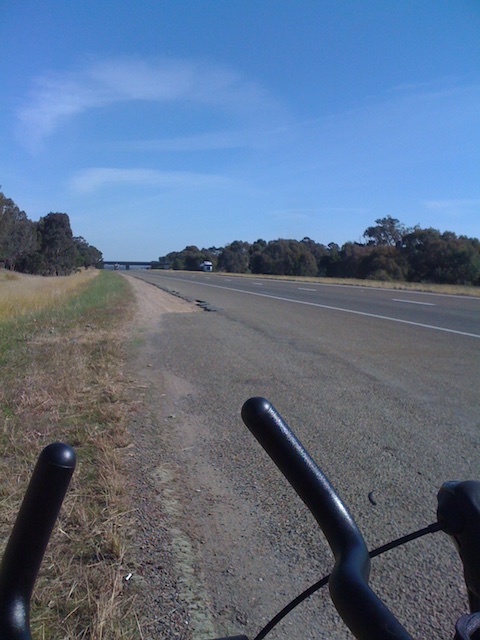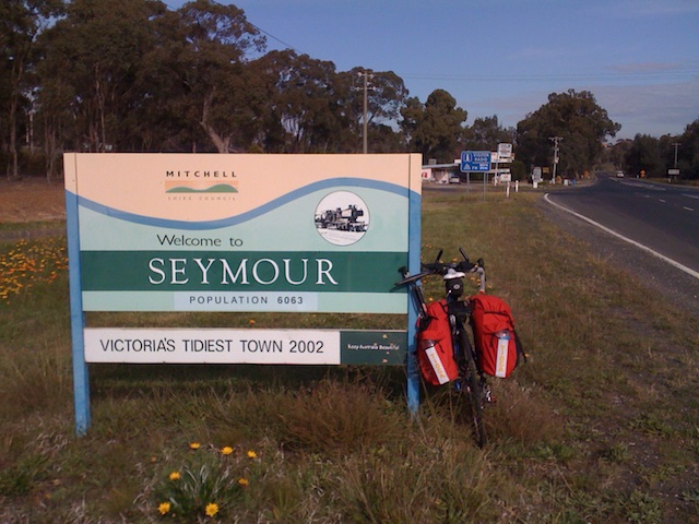 The temptation to forego my vegan diet for the sake of delicious calories hit me when the owner of the Benalla caravan park told me they served complimentary pancakes for breakfast, but I managed to motivate myself to get on the road before they started cooking and avoid the allure of a hot breakfast. 105km into Seymour today, during which I realised that my impression of Canberra to Melbourne being more or less entirely downhill was perhaps a little incorrect. Eventually, after about four hours of continual rolling hills, I made it into Seymour. The once-more obligatory shower and tyre-cleaning was followed by an uneventful but enjoyable wander around the streets of Seymour. As the afternoon grew cold and it began drizzling I realised how lucky I’d been for the entire trip, with just about perfect weather every day. A slightly frustrating afternoon trying to find decent vegan food ended with some hot chips (perfect for the cold, rainy weather) and take away Chinese followed by an evening listening to a Cory Doctorow audiobook and figuring out how to install a C compiler on my iPhone (my mind was obviously starting to tire of not having any technical challenges).