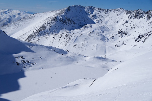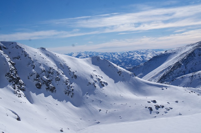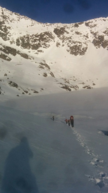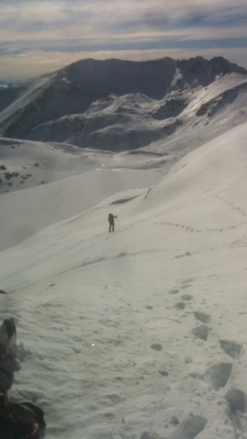 From the ski resort carpark we could almost, but not quite, make out the path halfway up the hill we needed to follow to cross to the western side of the range, where our climb was waiting.