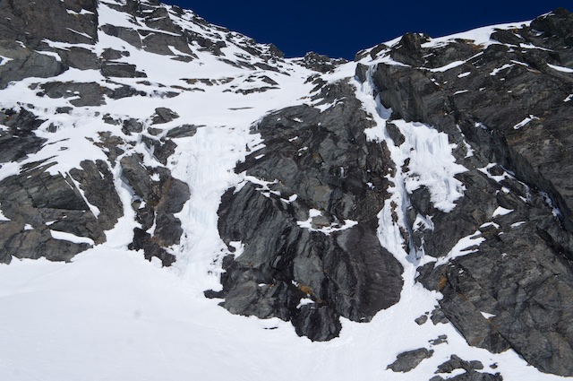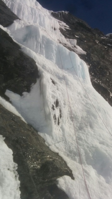 I enthusiastically jumped straight on ‘Alta Ego’, the middle route, but got nervous by a very soft (snowy) vertical section that seemed both quite difficult and impossible to protect a fall from with any degree of safety, and abandoned the climb after about 20m.