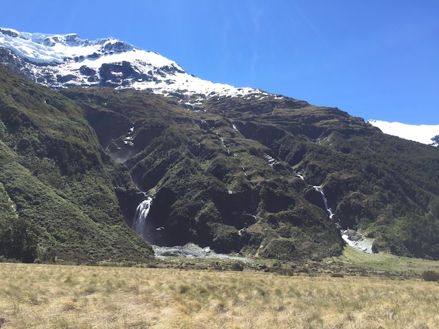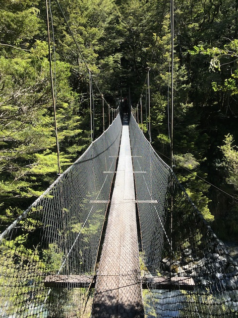 We awake to a perfect day and a surprisingly-tough 7.5km down French Ridge. That’s 7.5km horizontal. And, I guess, about 2km vertical. Very steep going and it’s mid-afternoon by the time we get into Aspiring Hut. The hut warden kindly books a bus back to Wanaka for us (and gets lightly reprimanded for it).