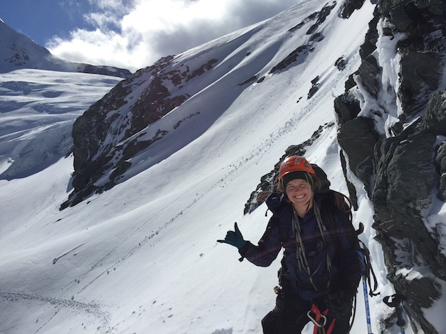 The first pitches are easy, with some cool views over long steep faces and crevassed glacier.