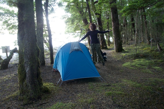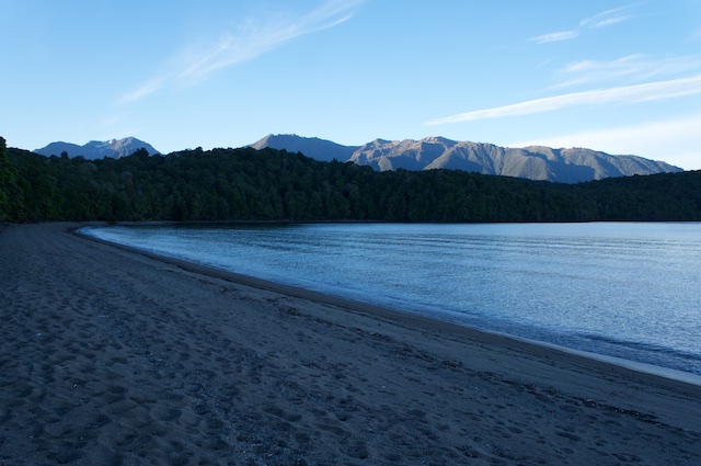 The first day for us was 17km into Brod Bay - It was originally going to be about 5km, but we had a tip at the DOC office that we could drive into the track further south to make the first day less silly (and, more importantly, knock the last day down from a worrying 30km). An easy and beautiful walk through Beech Forest on the side of the lake had us into Brod Bay shortly before sunset to set up camp and feast by the side of the lake, while sandflies feasted upon us.