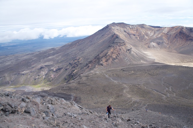 The landscape through the crossing was very alien and barren, and the very steep Mt. Ngauruhoe nothing but a deep pile of very loose shale and various-sized rocks.